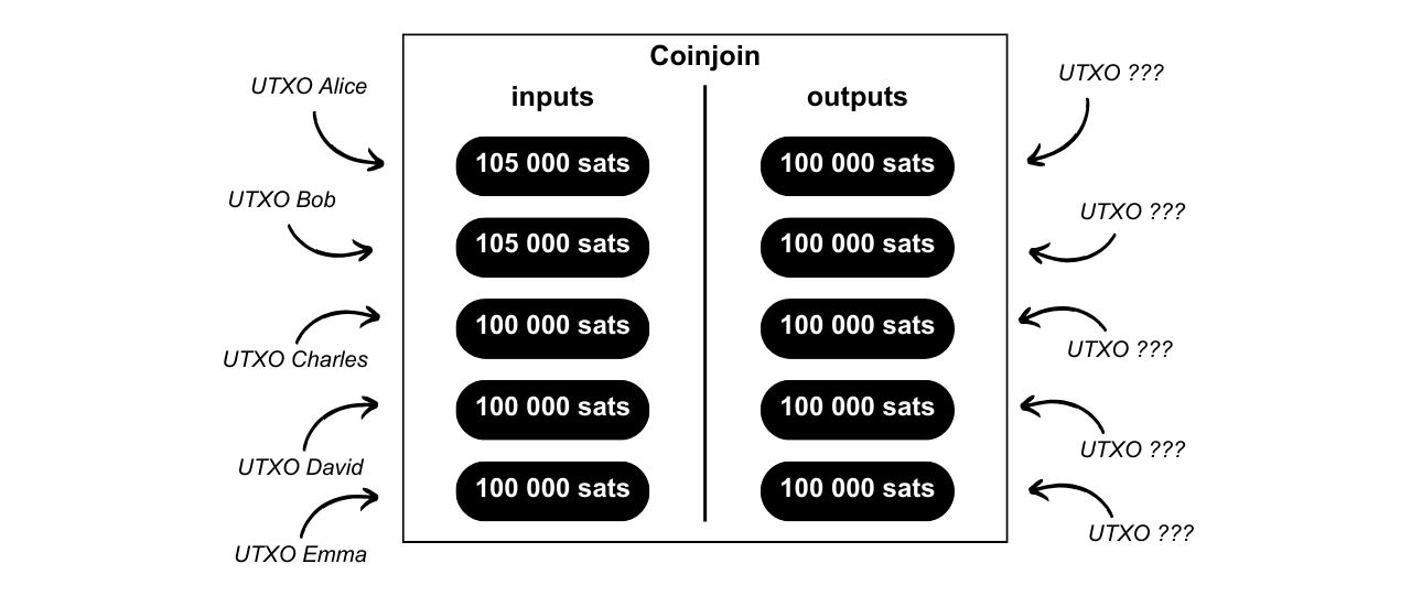 Le fonctionnement général du coinjoin est le suivant : différents utilisateurs souhaitant mixer déposent un montant en input d’une transaction. Ces inputs ressortiront en différents outputs de même montant. À la sortie de la transaction, il est donc impossible de déterminer quel output appartient à quel utilisateur. Il n’y a techniquement aucun lien entre les entrées et les sorties de la transaction coinjoin. Le lien entre chaque utilisateur et chaque UTXO est cassé, de la même manière que l’historique de chaque pièce.