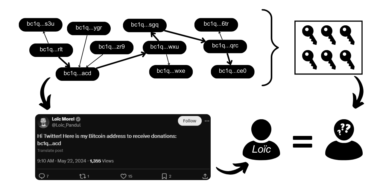 Dans le cadre de Bitcoin, l’OSINT peut être utilisée dans le but d’appuyer une analyse de chaîne pour tracer des fonds, notamment afin d’identifier un point d’entrée, c’est-à-dire un lien entre une activité on-chain et une forme d’identité appartenant à une entité réelle. Par exemple, si vous publiez votre adresse de réception sur Twitter sous votre nom, un analyste pourrait la retrouver et l’associer à votre identité.