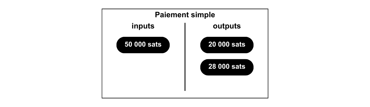 Ce modèle du paiement simple indique que nous sommes vraisemblablement en présence d’une transaction d’envoi ou de paiement. L’utilisateur a consommé son propre UTXO en inputs pour satisfaire en outputs un UTXO de paiement et un UTXO de change (rendu de monnaie qui revient vers le même utilisateur). Nous savons donc que l’utilisateur observé n’est vraisemblablement plus en possession d’un des deux UTXOs en outputs (celui du paiement), mais qu’il est toujours en possession de l’autre UTXO (celui de change).