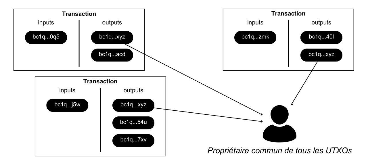 On dit d’une réutilisation d’adresse qu’elle est « externe » lorsqu’elle survient sur plusieurs transactions différentes. Dans cette configuration, la réutilisation d’adresse externe est une heuristique d’analyse de chaîne qui permet d’émettre une hypothèse vraisemblable selon laquelle toutes ces adresses appartiennent à une même entité.