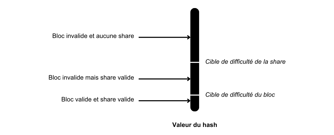 hash > share > bloc. - Si le hash est inférieur à la cible de difficulté de la share, mais supérieur ou égal à la cible de difficulté de Bitcoin, alors ce hash constitue une share valide qui n’est cependant pas suffisante pour valider un bloc. Le mineur peut envoyer ce hash à sa pool pour réclamer la récompense associée à la share :